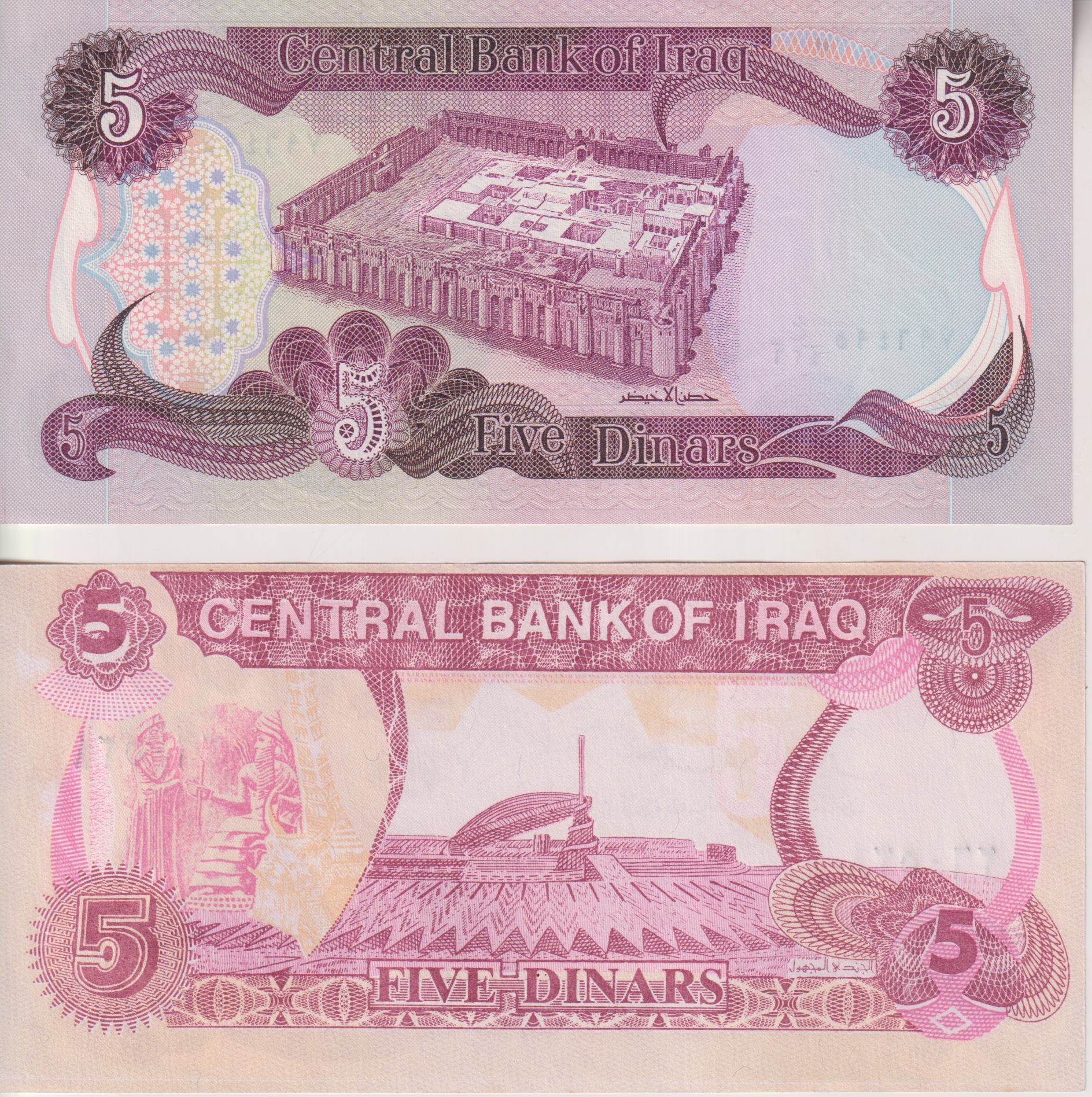 2x Iraq 5 Dinars 1980-82 & 1992 (Gulf War Emergency issue) P70,80 UNC SADDAM HUSSEIN