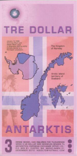 The note is themed around Norway’s historical claims and exploration in Antarctica: