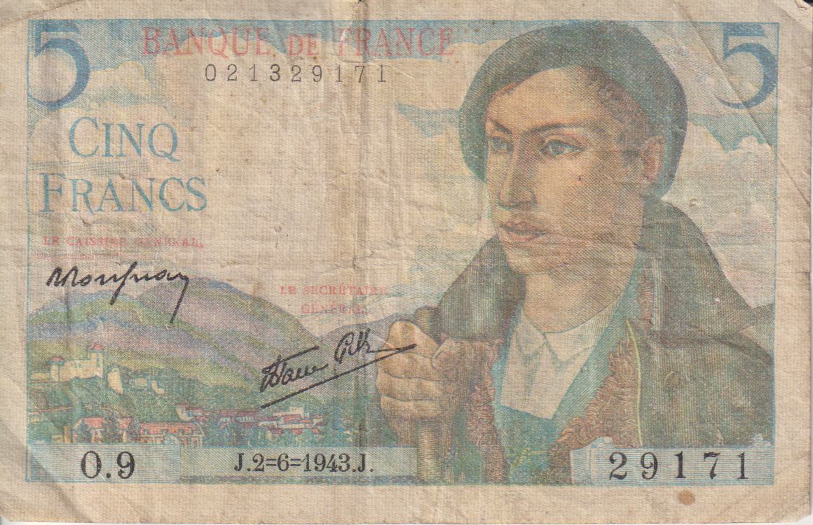 FRANCE 5 Francs 1943-47 P9  VG