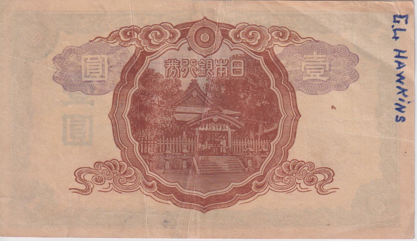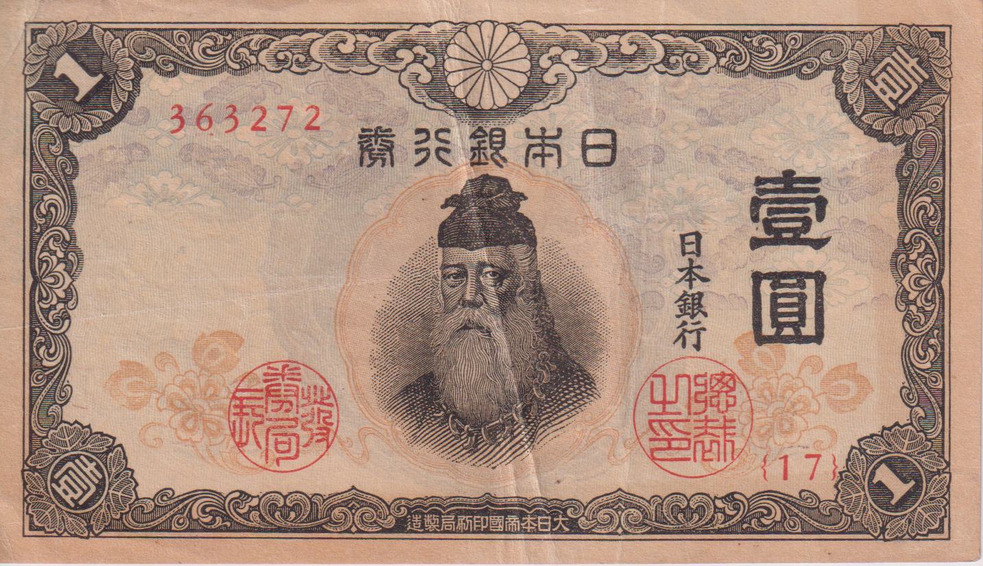 JAPAN 1 Yen with serial number 1943 P49 VF