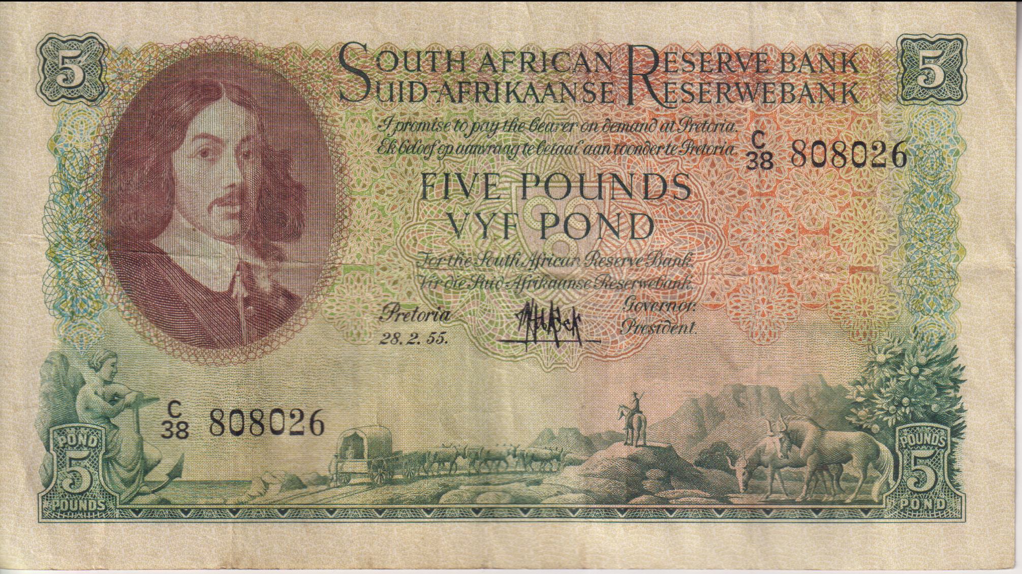 UNION OF SOUTH AFRICA 5 Pounds 1955 M.H.De Kock #195 C/38 808026 E/A VF