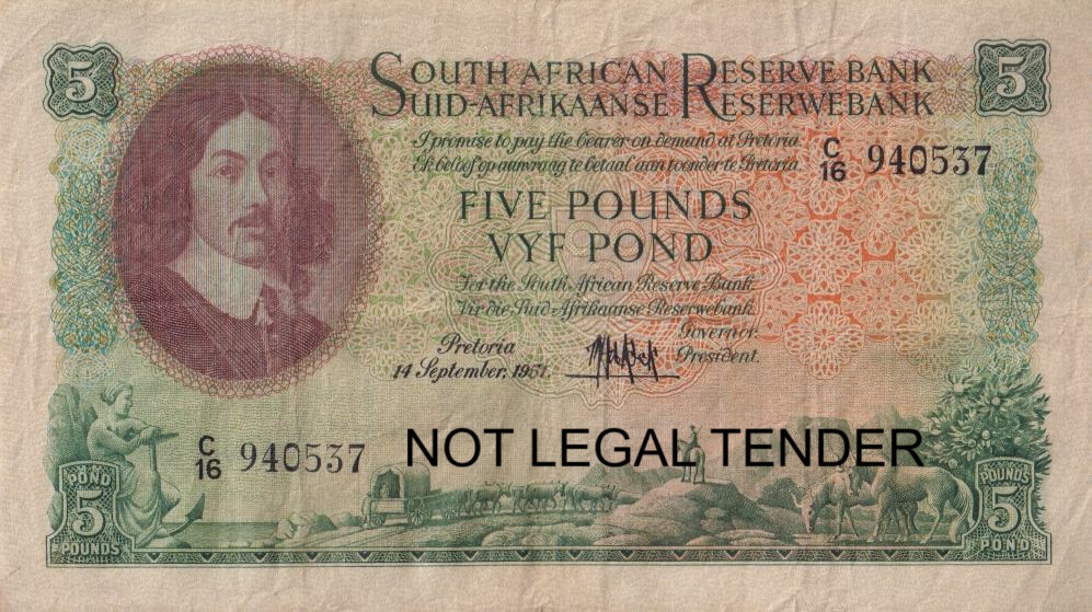 • UNION OF SOUTH AFRICA 5 Pounds 1954 M.H.De Kock #187 C/35 207038 A/E  F UNION OF SOUTH AFRICA 5 Pounds 1954 M.H.De Kock #187 C/35 207038 A/E F R150.00
