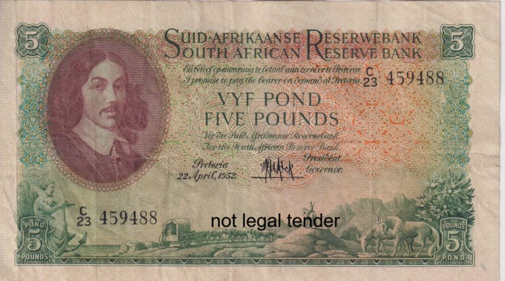 • UNION OF SOUTH AFRICA 5 Pounds 1954 M.H.De Kock #187 C/30 217298 A/E  VF UNION OF SOUTH AFRICA 5 Pounds 1954 M.H.De Kock #187 C/30 217298 A/E VF R280.00