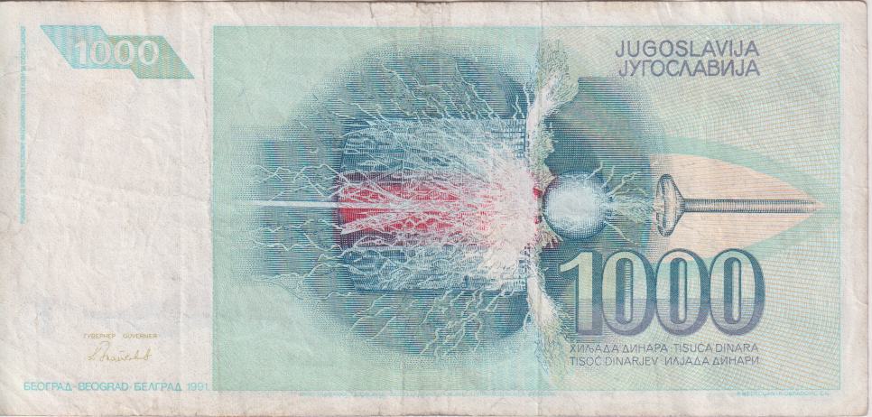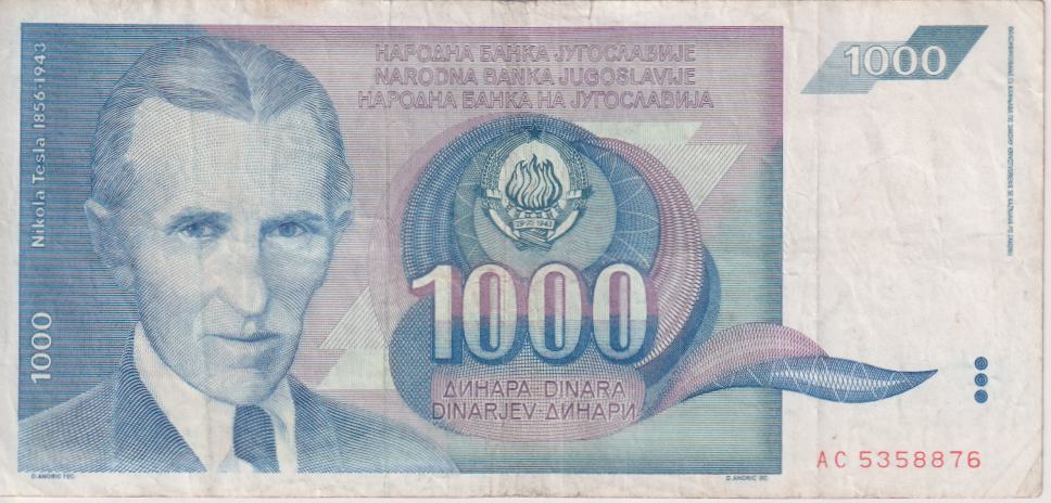 YUGOSLAVIA 1000 Dinara 1991 P110 F (Nicola Tesla)