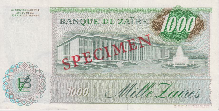 ZAIRE 1000 Zaïres 1985 P31s UNC - SPECIMEN NOTE - Image 2