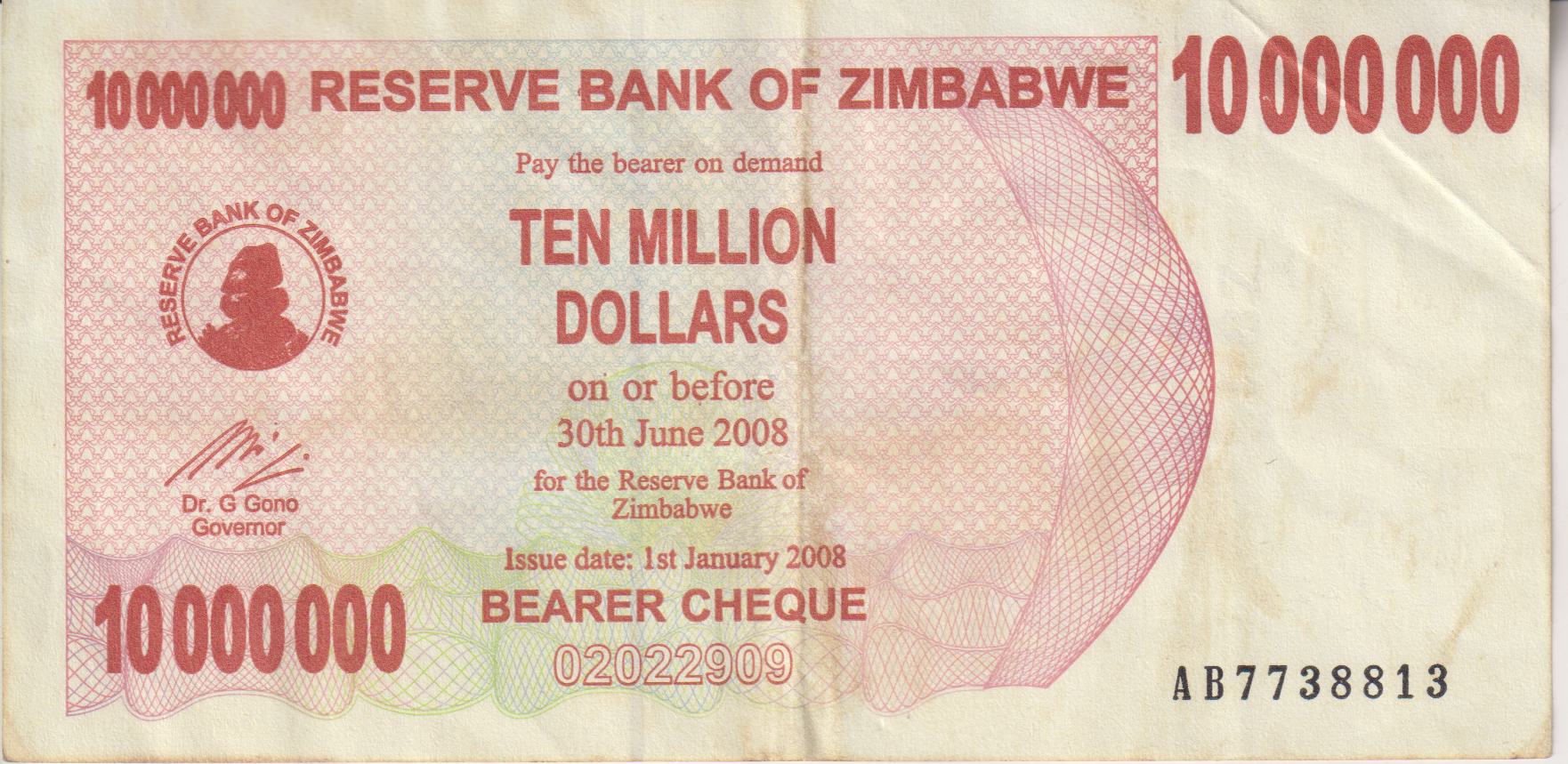 Zimbabwe 10 Million Dollars Bearer Cheque 2008 P-55 VF