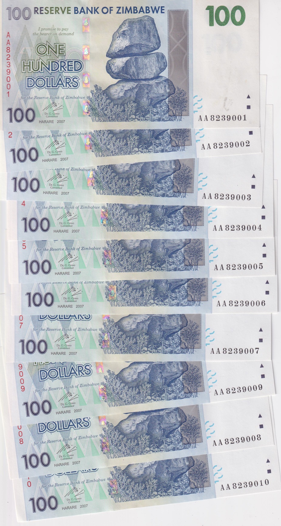 ZIMBABWE 100 Dollars 2007 P69 Serial #AA UNC 10x Consecutive numbers