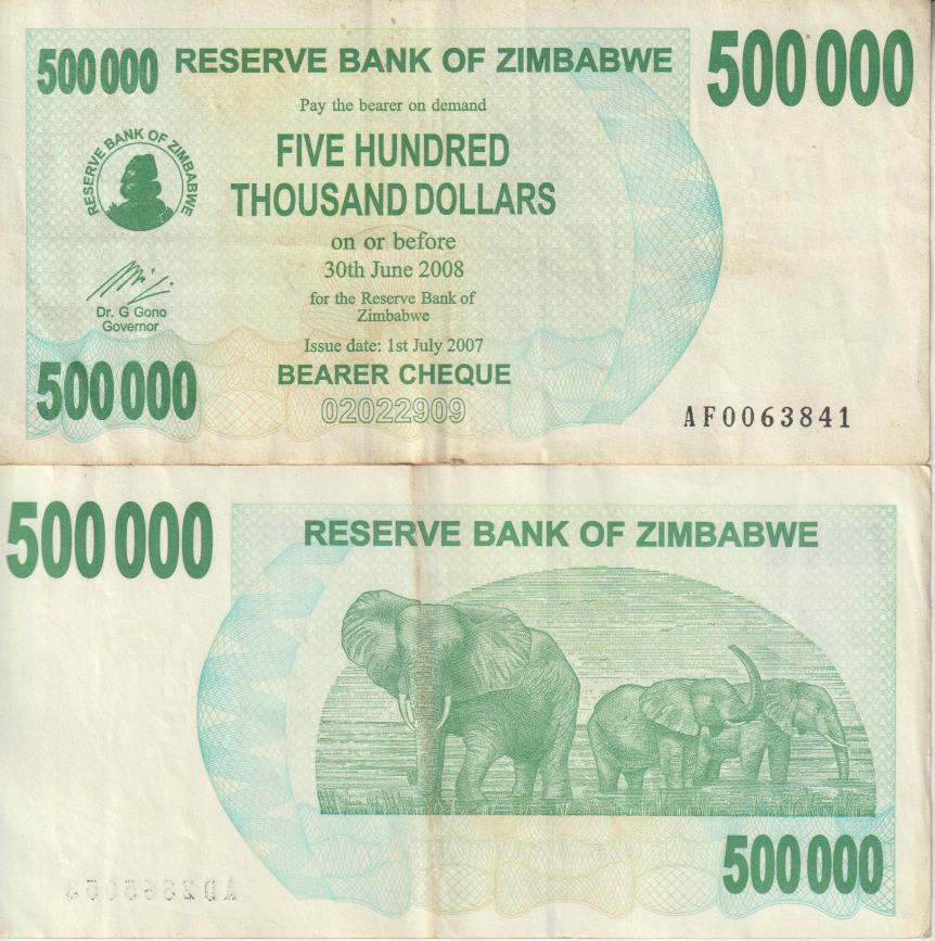 Zimbabwe 500,000 Dollars Bearer Cheque,2007 P-51 VF